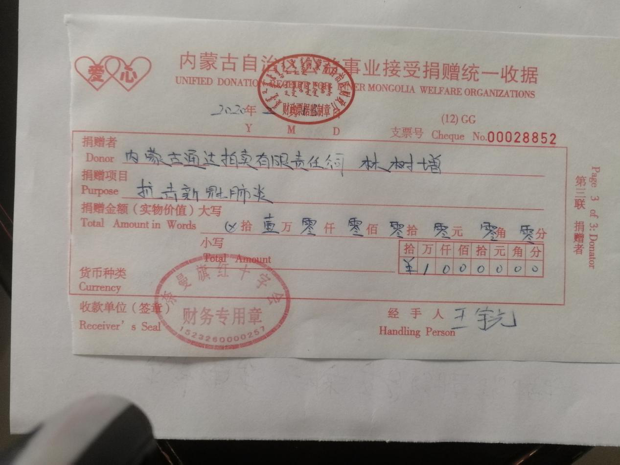 內(nèi)蒙古聯(lián)興拍賣有限責(zé)任公司向內(nèi)蒙古自治區(qū)紅十字會(huì)捐贈(zèng)了1000元防控疫情基金。內(nèi)蒙古拍賣愛心人士李虹、王鳳林、齊銘分別捐贈(zèng)了600元、500元、200元的愛心善款。 每每在中華民族的危難時(shí)刻,都會(huì)體現(xiàn)出我們團(tuán)結(jié)的力量,內(nèi)拍協(xié)號(hào)召所有拍賣企業(yè)和全體會(huì)員要把思想統(tǒng)一到黨中央國務(wù)院、以及自治區(qū)的決策部署上來,把行動(dòng)統(tǒng)一到各地黨委政府的防控要求上來,依法科學(xué)有序防控,確保各項(xiàng)工作措施落實(shí)到位。疫情面前,拍賣人在行動(dòng)!擔(dān)起協(xié)會(huì)職責(zé),我們將共同面對(duì)困難,充分發(fā)揮行業(yè)協(xié)會(huì)作用,勇于承擔(dān)行業(yè)責(zé)任,與國家共渡難關(guān),共同迎來拍賣行業(yè)的春暖花開! |