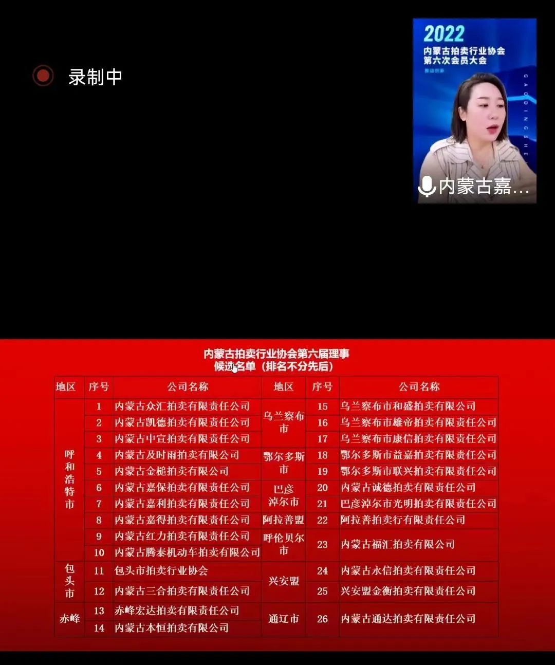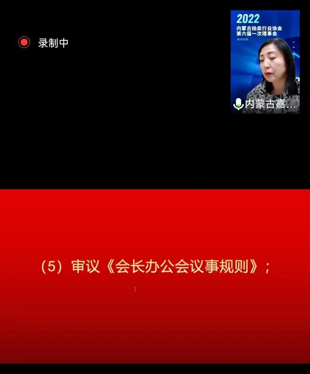 開拓進(jìn)取,銳意創(chuàng)新 內(nèi)蒙古拍賣行業(yè)協(xié)會(huì)第六次會(huì)員大會(huì)暨六屆一次理事會(huì) 勝利閉幕 2022年6月8日,內(nèi)蒙古拍賣行業(yè)協(xié)會(huì)第六次會(huì)員大會(huì)暨六屆一次理事會(huì)在內(nèi)蒙古拍賣行業(yè)協(xié)會(huì)會(huì)議室及線上騰訊會(huì)議室同步召開。全區(qū)有57家會(huì)員單位代表出席了會(huì)議。會(huì)議由第五屆副會(huì)長(zhǎng)蘆真主持。 特別鳴謝來(lái)自中拍協(xié)、北京拍協(xié)、上海拍協(xié)、廣東拍協(xié)、天津拍協(xié)、河北拍協(xié)、湖北拍協(xié)、湖南拍協(xié)、吉林拍協(xié)、江西拍協(xié)、寧夏拍協(xié)、青海拍協(xié)、山西拍協(xié)、陜西拍協(xié)、云南拍協(xié)、浙江拍協(xié)、重慶拍協(xié)、黑龍江拍協(xié)等兄弟省市協(xié)會(huì)發(fā)來(lái)的賀信與賀電。 根據(jù)會(huì)議議程,大會(huì)審議通過(guò)了《內(nèi)蒙古拍賣行業(yè)協(xié)會(huì)第五屆理事會(huì)工作報(bào)告》、《內(nèi)蒙古拍賣行業(yè)協(xié)會(huì)第五屆理事會(huì)財(cái)務(wù)報(bào)告》;第五屆理事會(huì)會(huì)長(zhǎng)王志江為到達(dá)現(xiàn)場(chǎng)的企業(yè)代表頒發(fā)了抗疫期間愛心企業(yè)捐贈(zèng)證書和企業(yè)信用等級(jí)評(píng)級(jí)證書,同時(shí)會(huì)議以線上無(wú)記名投票的方式選舉產(chǎn)生了第六屆理事會(huì)理事單位26家。 在第六次會(huì)員大會(huì)結(jié)束后,新任理事召開了六屆一次理事會(huì),理事會(huì)由協(xié)會(huì)副會(huì)長(zhǎng)蘆真主持。 理事會(huì)中,以線上無(wú)記名投票的方式,選舉產(chǎn)生了新一屆協(xié)會(huì)負(fù)責(zé)人,趙軍同志任會(huì)長(zhǎng),娜晴同志任秘書長(zhǎng),同時(shí)選舉產(chǎn)生了14位副會(huì)長(zhǎng),分別是:王志江、賈世軍、王罡、王文賢、蘆真、郭素英、裴學(xué)文、王峰、林樹增、閆建兵、李曉玲、劉劍、蘇智慧、馬文平。六屆一次理事會(huì)還審議通過(guò)了新一屆的《會(huì)長(zhǎng)辦公會(huì)議事規(guī)則》,討論了協(xié)會(huì)下半年的工作計(jì)劃及方向。 最后,新任會(huì)長(zhǎng)趙軍做了總結(jié)講話,趙會(huì)長(zhǎng)表示:這幾年來(lái),我區(qū)拍賣業(yè)持續(xù)快速增長(zhǎng),取得了長(zhǎng)足發(fā)展,相信在未來(lái)五年內(nèi)一定能夠取得更大的成就,對(duì)我區(qū)行業(yè)發(fā)展產(chǎn)生更加深遠(yuǎn)影響。我們新一屆的領(lǐng)導(dǎo)班子也將全心全意為企業(yè)服務(wù),幫助企業(yè)解決問題,維護(hù)會(huì)員單位的合法權(quán)益,規(guī)范職業(yè)操守,直面疫情時(shí)代的機(jī)遇與挑戰(zhàn),按照高質(zhì)量發(fā)展的要求,一步一個(gè)腳印,團(tuán)結(jié)奮斗,促進(jìn)我區(qū)拍賣業(yè)的全面發(fā)展,相信我區(qū)拍賣業(yè)在未來(lái)的五年時(shí)間會(huì)邁上一個(gè)新的臺(tái)階,再創(chuàng)輝煌。